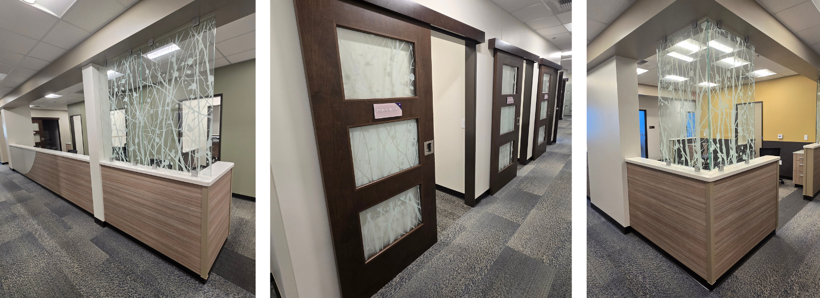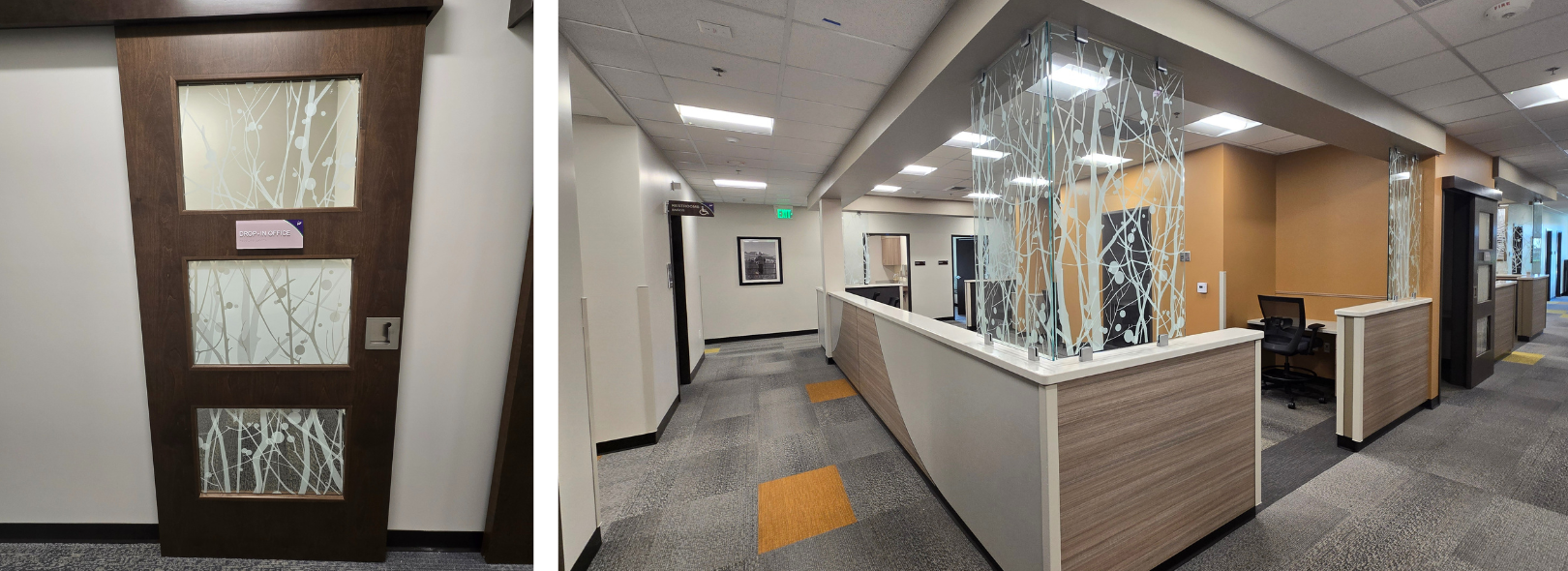This project was specified by Neenan Archistruction of Fort Collins, CO, to bring a touch of nature into the nurses’ stations. The Winter Trees pattern in DWCF (Decorative White Crystal Film) was chosen to incorporate biophilic design, creating a calming and inviting space. The doors feature the Winter Trees pattern in DWCF on the top and bottom panels, while the middle panel uses PWEF (Privacy White Etch Film) to balance aesthetics with added privacy.