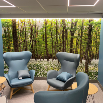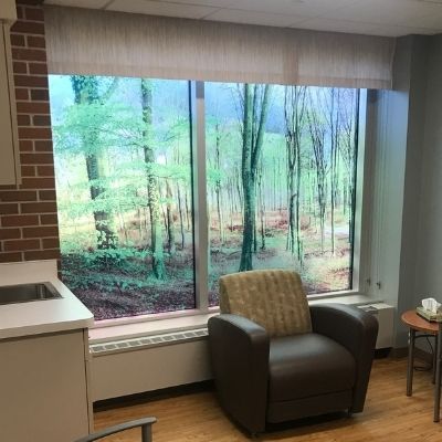 The Olee team worked with Memorial Hospital Leadership to add a unique Type II custom wall covering to the Memorial Discharge Lounge to add environmental enhancement and biophilic design. This custom wall covering makes the discharge lounge a more pleasant and intriguing area for patients and staff.