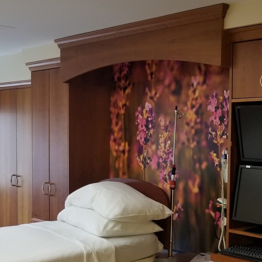 The Olee team worked with the interior designer to select uplifting nature images for the headwalls that brought comfort and beauty to the family space and pulled the art, fabric, and color scheme of the room together. Olee Creative Type II wallcovering was an affordable and transformative solution.