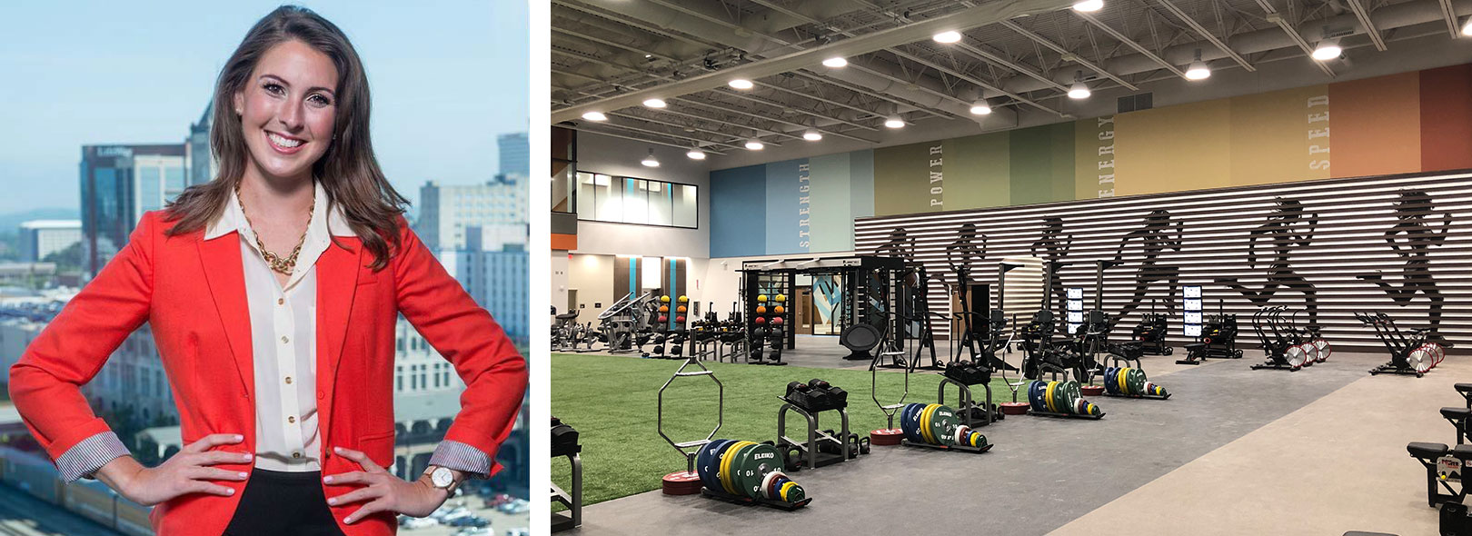 "The design goal for the gym was to motivate and inspire patients to move. This goal of movement shaped the overall design of the graphics. The custom Olee window film is an abstracted movement of a ball bouncing. Above the film, bold inspirational words printed on a large gradient panel represents a heat map of your body temperature when working out. The idea of someone starting their journey only being able to walk and then over time becoming stronger and advancing to a run is what drove the graphic behind the slat wall. I thought this would motivate gym goers from physical therapy patients to professional athletes to keep pushing themselves to be better and strive for the best. I wanted to abstract the graphic with wood planks to make it more visually interesting as well as warm up the space." -Haley Eakin