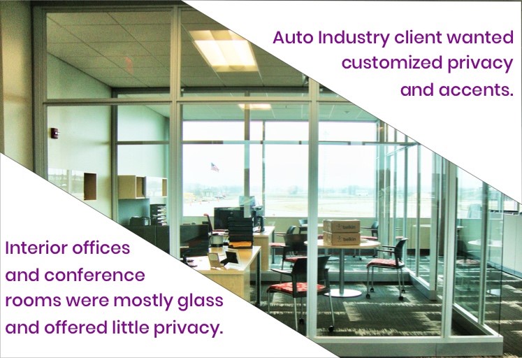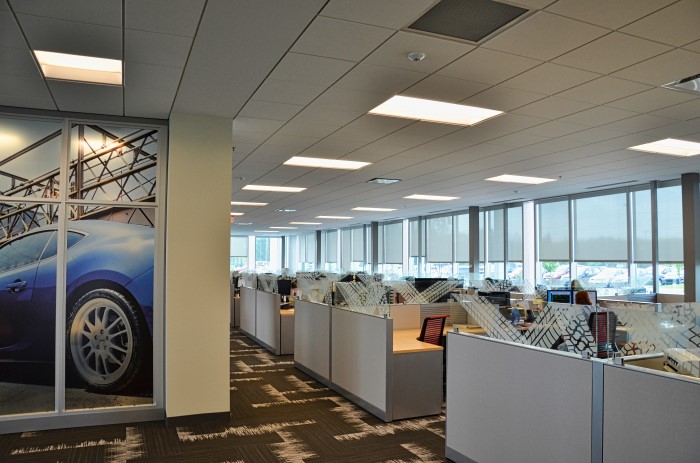 Service center conference rooms and leadership offices are surrounded by glass on the interior of the building and offered little privacy. With over 100 phone staff, the leadership team also wanted to create visual interest and reinforce the corporate brand with creative design.