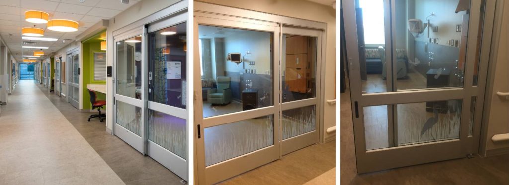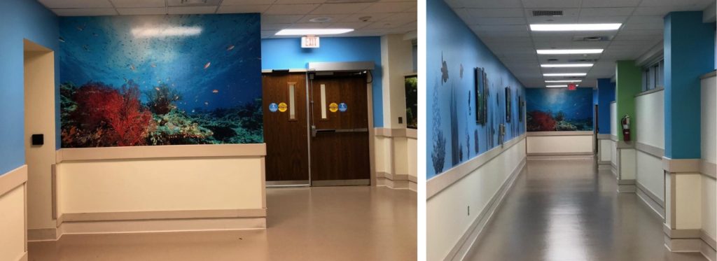 Prior to installation, this was a very sterile corridor with light colored paint and transom windows that brought a lot of light into the area. Patients were being transported via gurney through this corridor and the hospital wanted to add biophilic artwork to ease anxiety and provide patient comfort. Olee Creative worked with the marketing team and radiology manager to transform this space into an underwater ‘aquarium’ using biophilic interior design as inspiration. The Olee team created a wall mural and wall graphic decals using corporate paint colors to represent an ‘underwater’ world of the ocean and aquariums to transform the space for both patients and staff.
