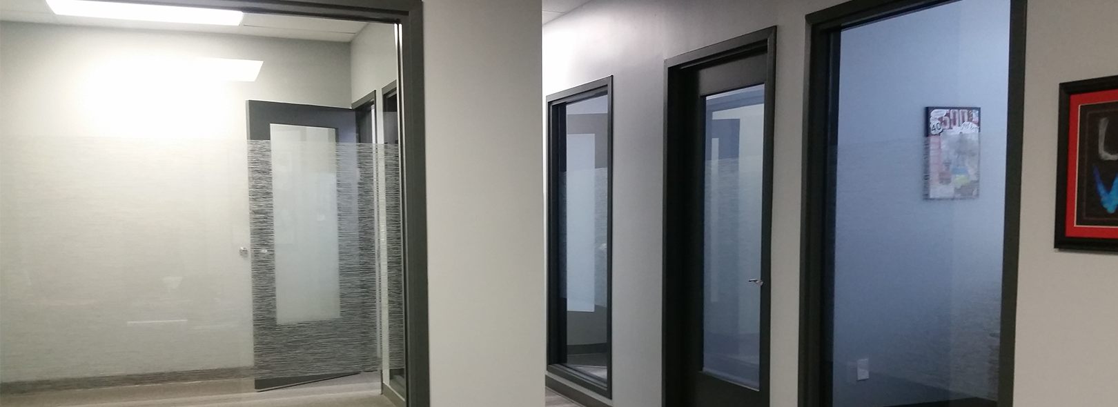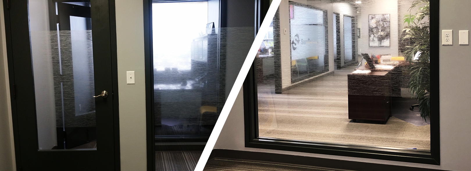 Result/Solution: A graphic distraction band was created and cut by the Olee install team. 3M™ Fasara™ film in the Grain Silver pattern was chosen and installed horizontally. The metallic silver ink is subtle, but really complements the modern feel of the space.