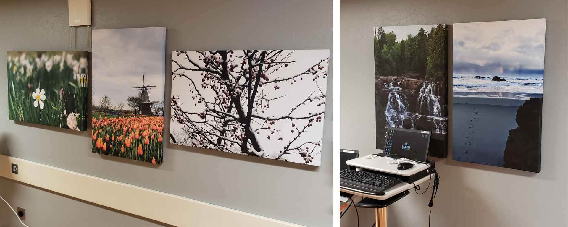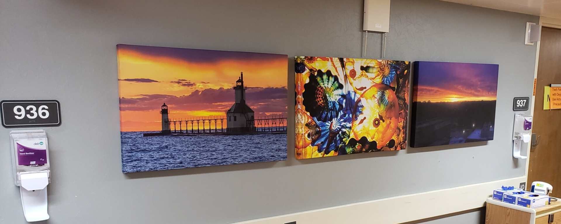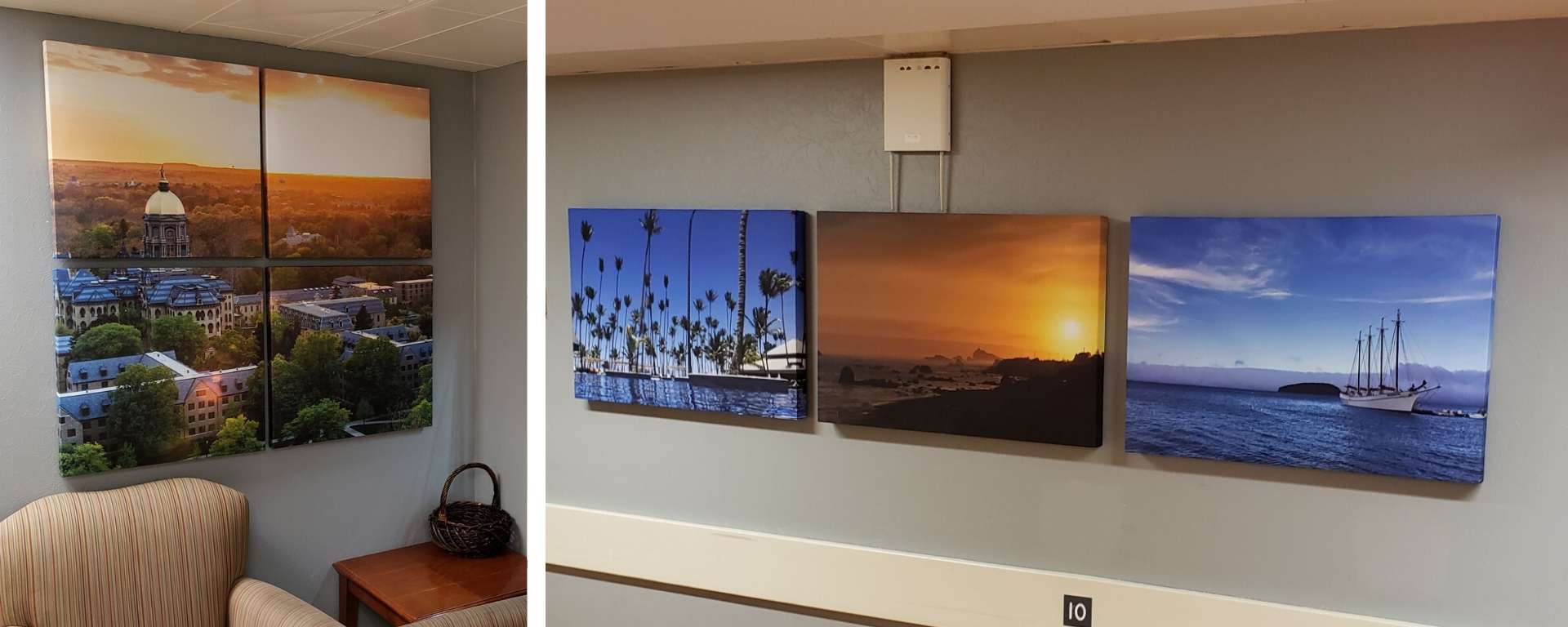Result/Solution: The Memorial 9 South Staff submitted over 80 scenic photos via a bulletin board for the project and voted for their favorites. Olee Creative reviewed the favorite images for resolution and clarity to ensure quality acoustical artwork could be developed. Olee Creative worked to group the acoustical artwork together in pleasing and colorful arrangements for six different areas of the unit. The staff was extremely excited to see their art on display after the installation was complete. Olee Creative’s acoustical artwork is a great way for architects and interior designers to add add functional and visual aesthetic appeal to their projects. This impressive art display allows the designer’s creativity to shine while creating a comfortable and memorable space. Several substrate & hardware options are offered and artwork can be spaced according to your specification. The Olee team can assist with the selection of images to complement the theme and colors of the space. Choose images from our vast stock photo collection, several well-known photographers, or provide your own.