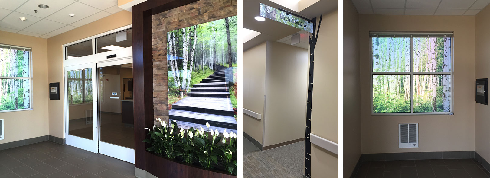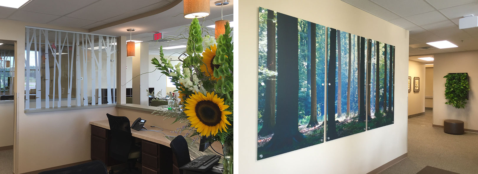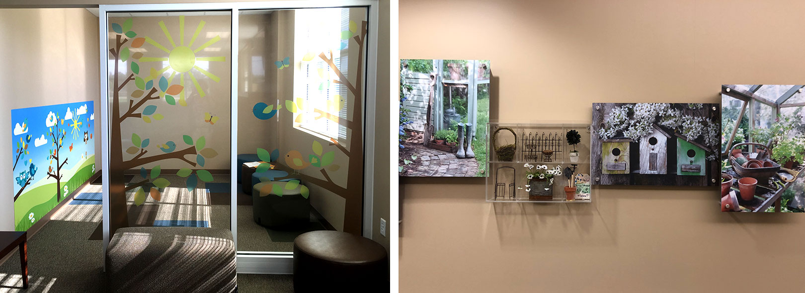 Results: The Olee Creative team worked with facility leaders to create a calming environment filled with soothing images. A digitally printed custom window film was curated for the front entry to block parking lot vehicles, as well as complementary standoff and positive distraction artwork, custom window film and magnetic graphics system for the children’s playroom, custom wayfinding signage, and decorative cut etch window film in OleeVue pattern Birch 449. “The Olee design team helps us bring our ideas, themes, and concepts to life. Working with one point of contact for signage, collages, wall graphics, window film, artwork and custom pieces makes our job easier. The quality of work is exceptional. I highly recommend Olee Creative!” -Holly Foley