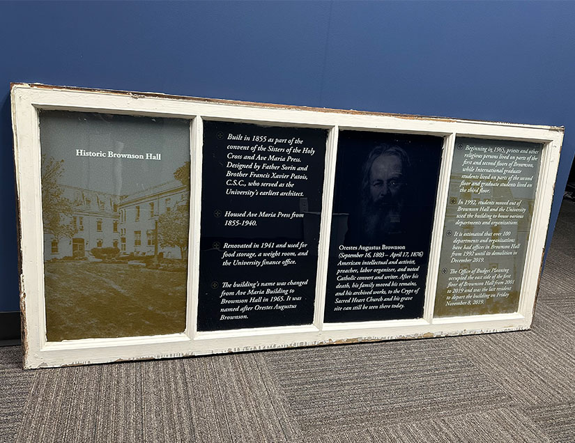 Result/Solution: The Olee team was provided a skyline view of the Notre Dame campus and printed the image on Decorative Glaze (faux etch ink on clear polyester film). Notre Dame also had windows from the original building that had been demolished and wanted to add a touch of history to the glass and installed them as artwork. Olee printed graphics with historical details for the glass panes.