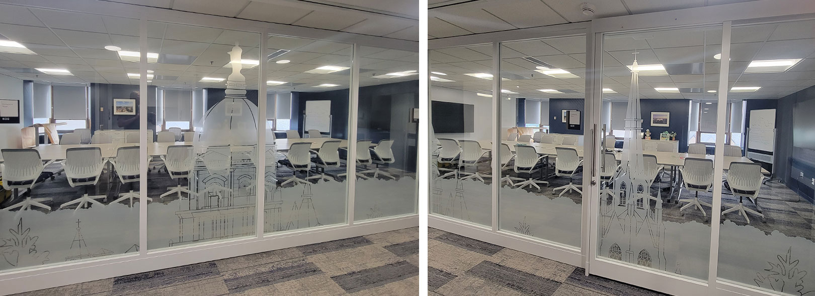 Goal: Add a touch of personalization to the Notre Dame Grace Hall Budget Office conference room glass.