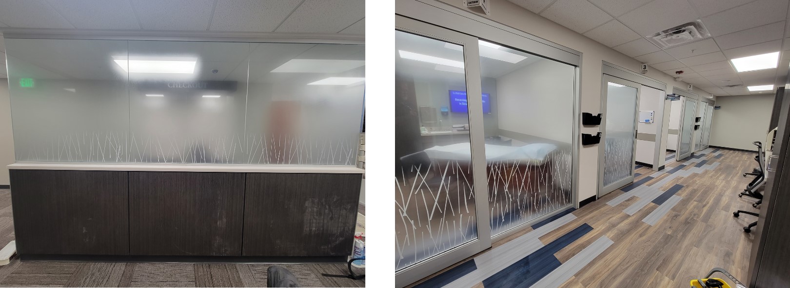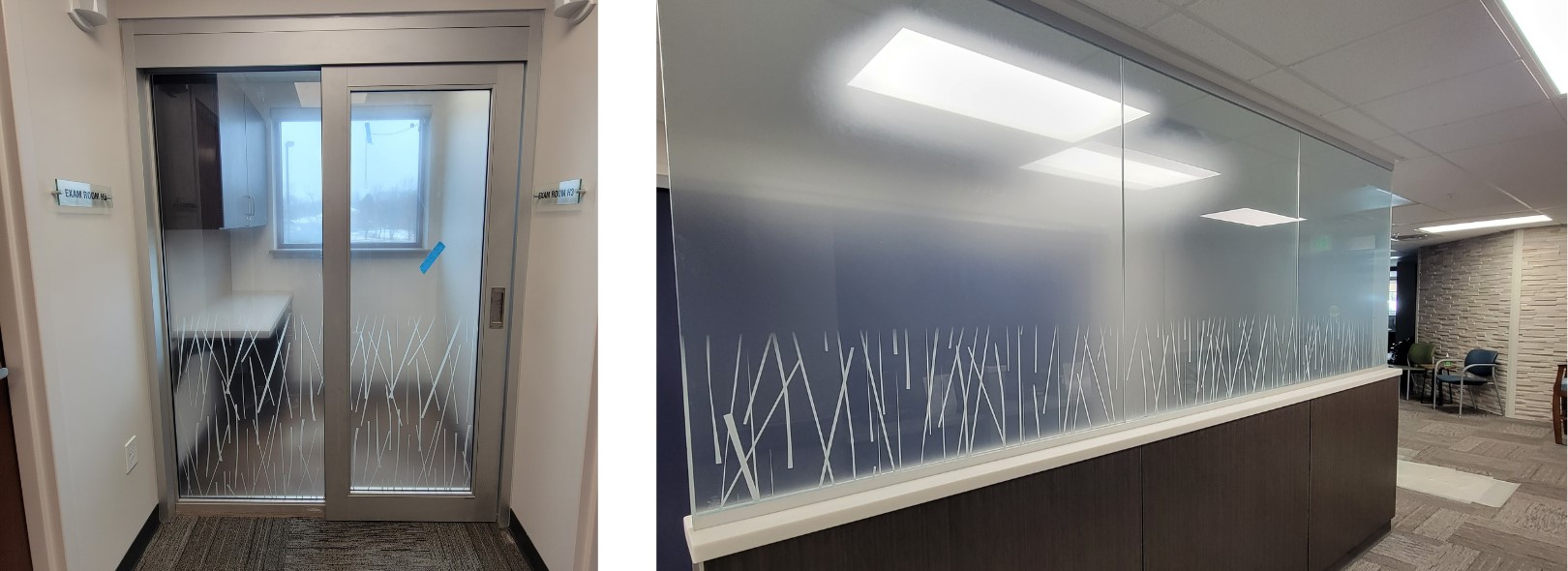 Goal: Upgrade and modernize the space. For the window film, we used the OleeVue Sticks pattern in white ink for a clean modern design. We created a custom fade to provide privacy below desk level and still allow plenty of light.