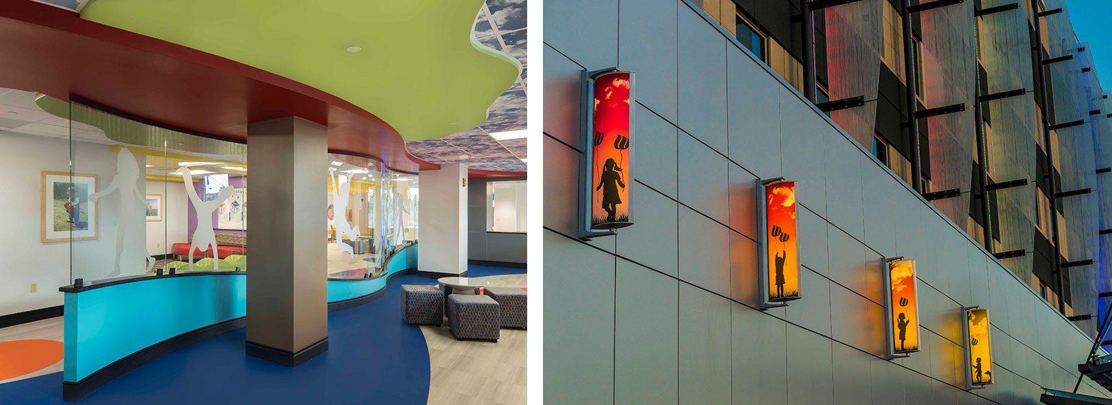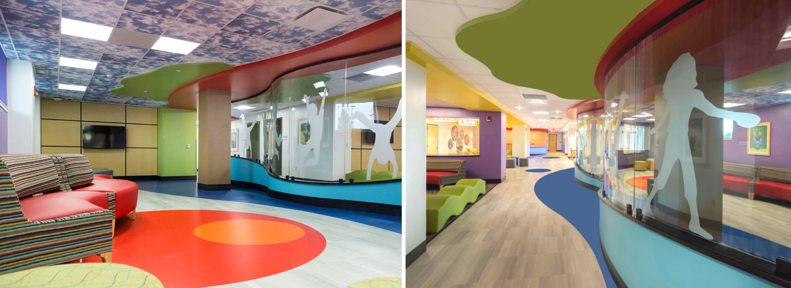 Result/Solution: Olee Creative worked with interior designer Tiana Lemons of Gould Turner Group to bring this space to life and create a family-centered healing environment to ensure pediatric patients and their families feel comfortable. The Olee design team created these custom silhouettes from etch film and coordinated the field measurements & installation to guarantee a flawless and fun finished space.