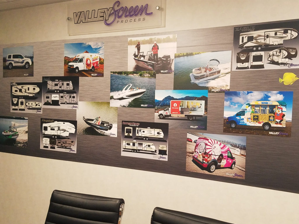 In the conference room, the same method was utilized, except a large two sided magnet was applied to the wall, and a background mural was printed in a charcoal textured gradient print. The company’s current RV, Marine, and Fleet customers are highlighted on individual 11” x 17” magnetic receptive sheets to showcase the company’s work and capabilities. Projects can be updated continuously to keep the display current. To learn more about this system, please watch the video on our website.