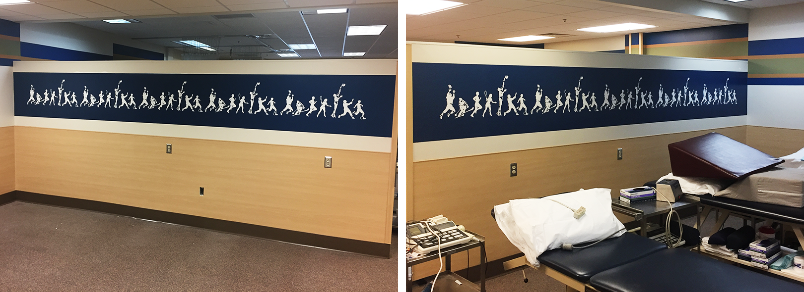 Result/Solution: The Olee Team worked with Valerie Melcher of ArTech and Adam Miller of Pointe General Contractors to design, print and install this custom self-adhesive wall film at the Center for Sports Medicine. Valerie’s design vision was carried out using silhouettes of various athletes, and the Olee Team color matched to the paint used in the space. A challenge was getting the film to adhere to the low VOC paint used in the project. Olee chose their extra-tac air egress film as the substrate for this project, and the result was a perfect installation! Olee Creative has a wide variety of self-adhesive substrates and will help select the perfect solution for your project.