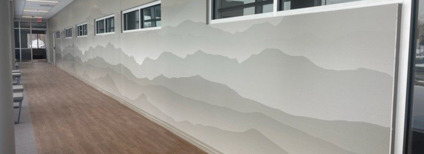 Result/Solution: Olee digitally printed a mountainscape on white film, sized 828.25"W x 96"H with 17 paneled graphics. Our Creative team custom color matched the ink to match the Sherwin-Williams paint color specified by the interior designer. The perfect match allows for the custom film to blend into the wall. The contour cut along the top of the graphic allows the background paint color to show at the top of the wall.