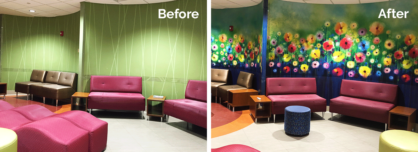Result/Solution: The Olee Team worked with interior designer Holly Foley and Memorial leaders to develop a bright and cheerful wall covering for the OB waiting area. The area is in use 24/7 and wall damage occurs when furniture scrapes the wall during cleaning or when family members re-arrange. An added challenge was to bring together the existing mismatched furnishings and color scheme with a minimum of additional cost. There was no budget to replace the furniture, so the Team’s challenge was to bring everything together at the lowest cost possible. Adding a navy blue paint accent to the trim between the wall sections, which accentuated the navy in the new wall covering, really made the area pop. Colors were selected to complement the furnishings, and to really add value, Olee Creative’s new Impact Resistant Wall Covering was used. This wall solution features a tough polycarbonate overlaminate that protects the self-adhesive film from abuse. The before pictures not only illustrate the issues with wall damage and the unsightly plastic protective trim, but also the drab colors that all needed to be pulled together. Quite an improvement!