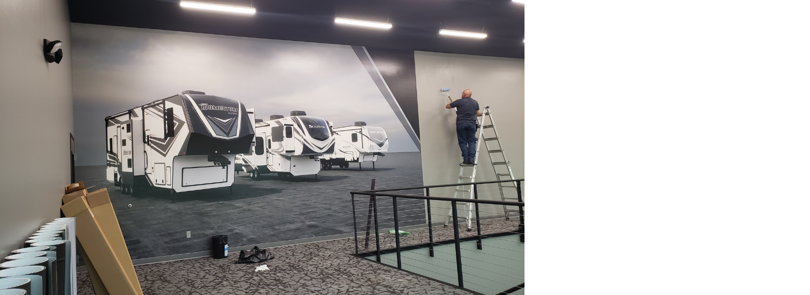 Goal: Cover a blank wall about 20' X 90' with a image provided by Grand Design RV.