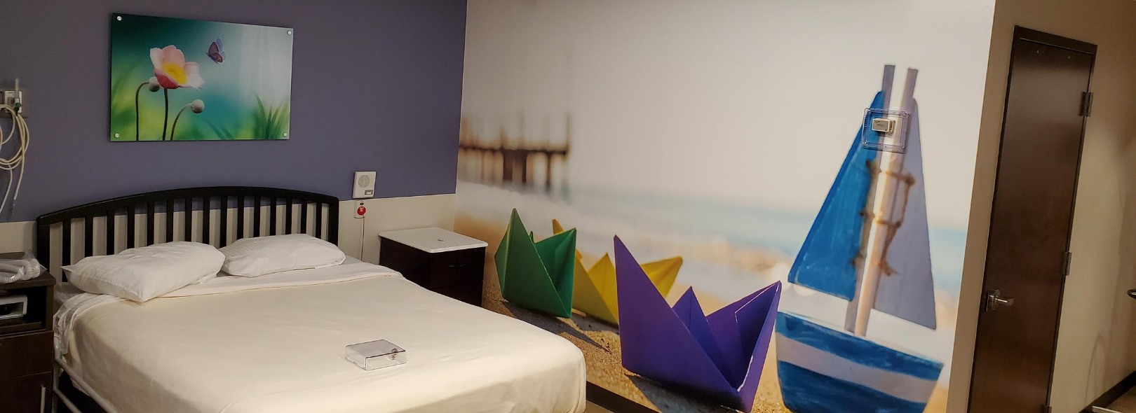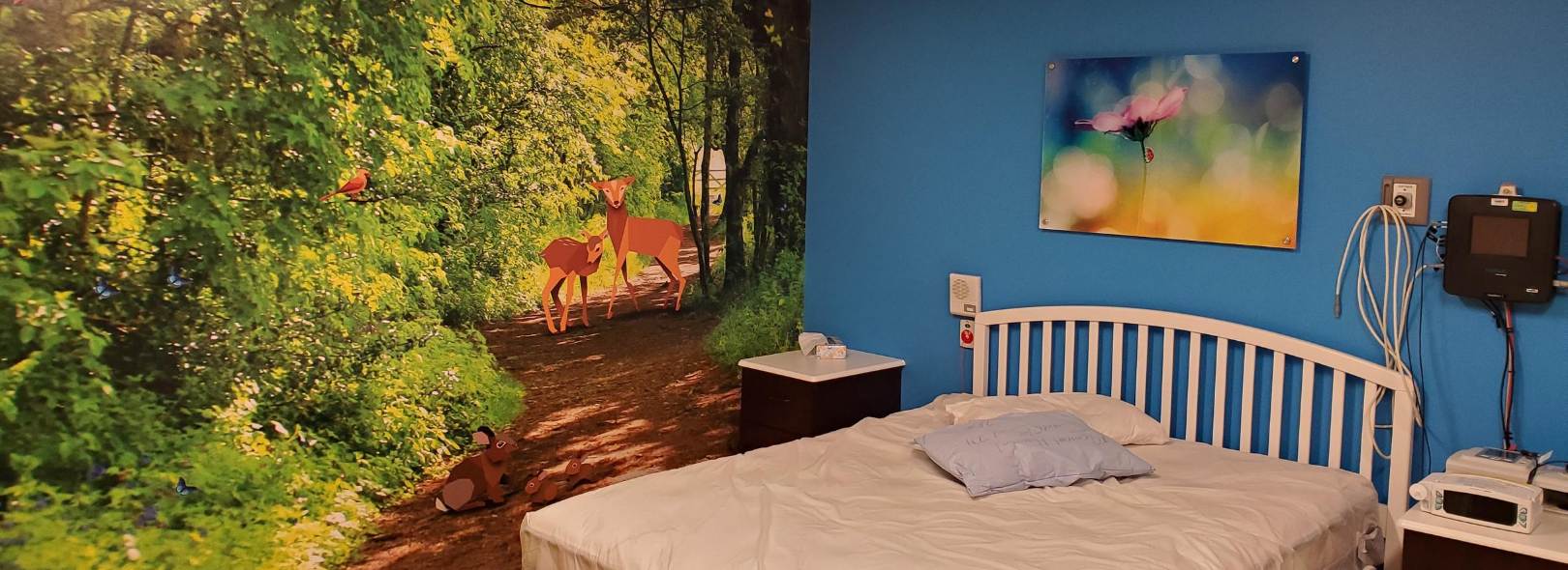 Result/Solution: Memorial contacted the Olee team about adding artwork to the patient sleep study rooms that were very sterile in appearance. They have a high population of children and adolescents that are tested, so they wanted to carry the graphics over from the their local children’s hospital to provide familiarity, continuity and comfort for two of their patient rooms. The accent walls were already painted so Olee selected images inspired by biophilic interior design that complement the existing color palette. Olee Creative employs a wide variety of self-adhesive wall covering substrates and laminates to meet any challenge, and will help select the perfect solution for your project!