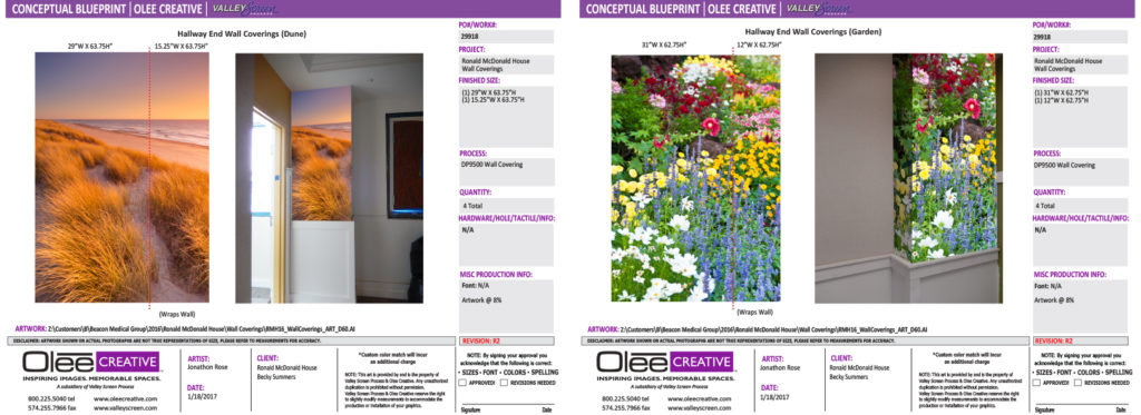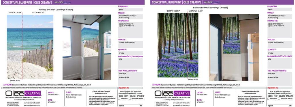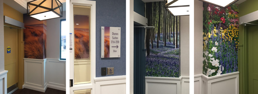 Solution: Olee Creative worked with the facility owner and Tango Design, comprised of Allison Bogunia, Amy Bernth & Katie Toothaker on this project in South Bend, Indiana. The environment needed to be comforting as well as provide a way for guests to navigate the space. The design team created four quadrants of guest locations and a ‘theme’ for each quadrant was incorporated into the signage, biophilic artwork and colors. The Olee Creative Type II wallcovering was an affordable and transformative solution.