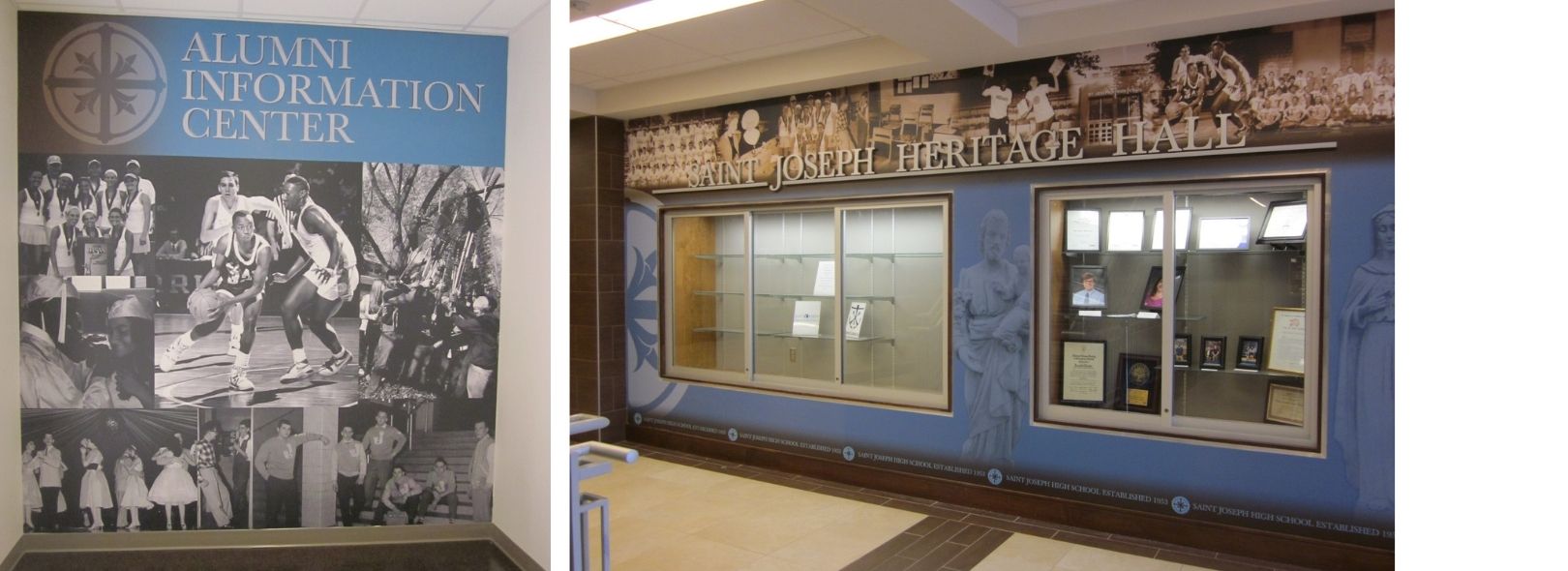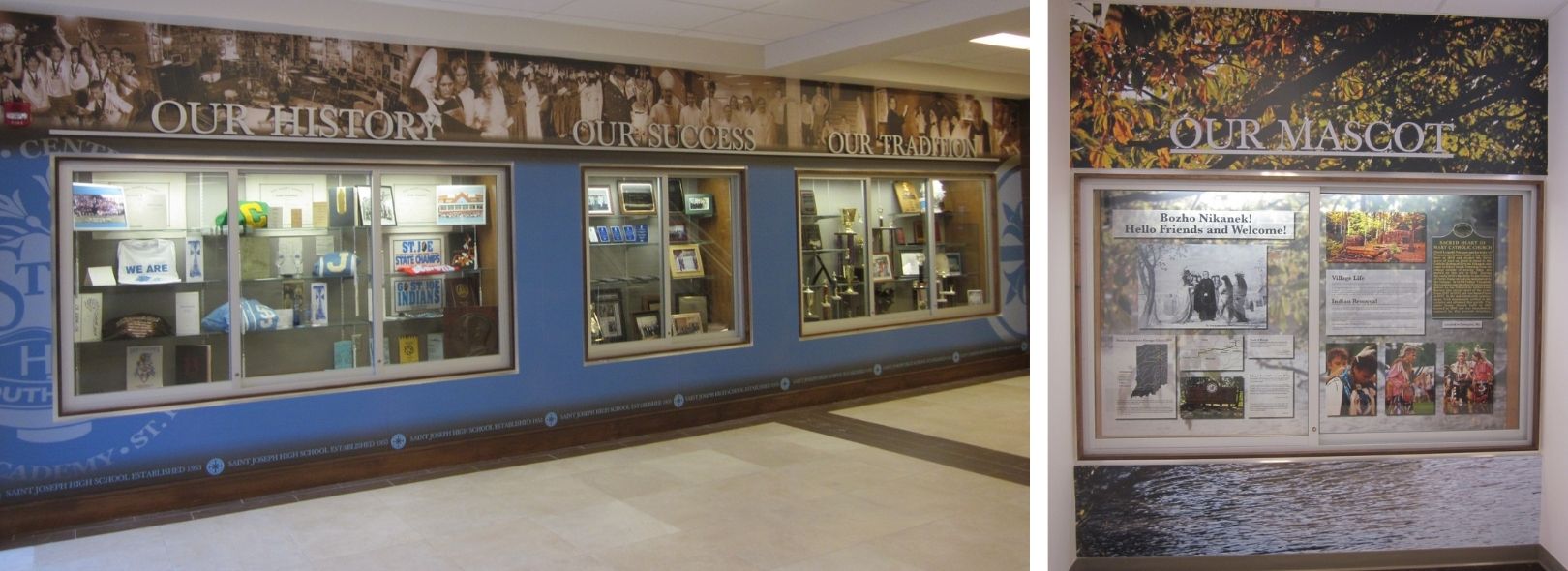 Solution: Type II wall murals were developed for the brand new St. Joseph High School in South Bend to add a bit of history to the new building. Images from the school’s archives were utilized to tell the story of the school’s first 50 years. In the grand hall, the trophy cases were surrounded with historical images, and featured the school’s old and new logo, mission statement and patron saint, St. Joseph, setting the stage for a new chapter in the school’s history book.