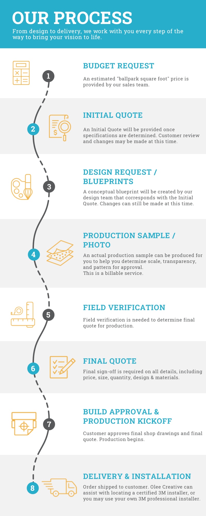 We will work with you from design to installation to make sure your creative vision is brought to life! Our professional team has over 53 years of leveraging creative design and technology to provide impactful printed products that provide privacy and influence, while creating comfortable, healing and memorable spaces. By incorporating custom images and design elements from your space, we can create an integrated look that seamlessly complements your environment. We also have pre-designed patterns from nature-inspired to simple or whimsical that can save you time and inspire creativity. Our team will work with you from beginning to end, making sure the whole project is completed in an efficient, professional manner.